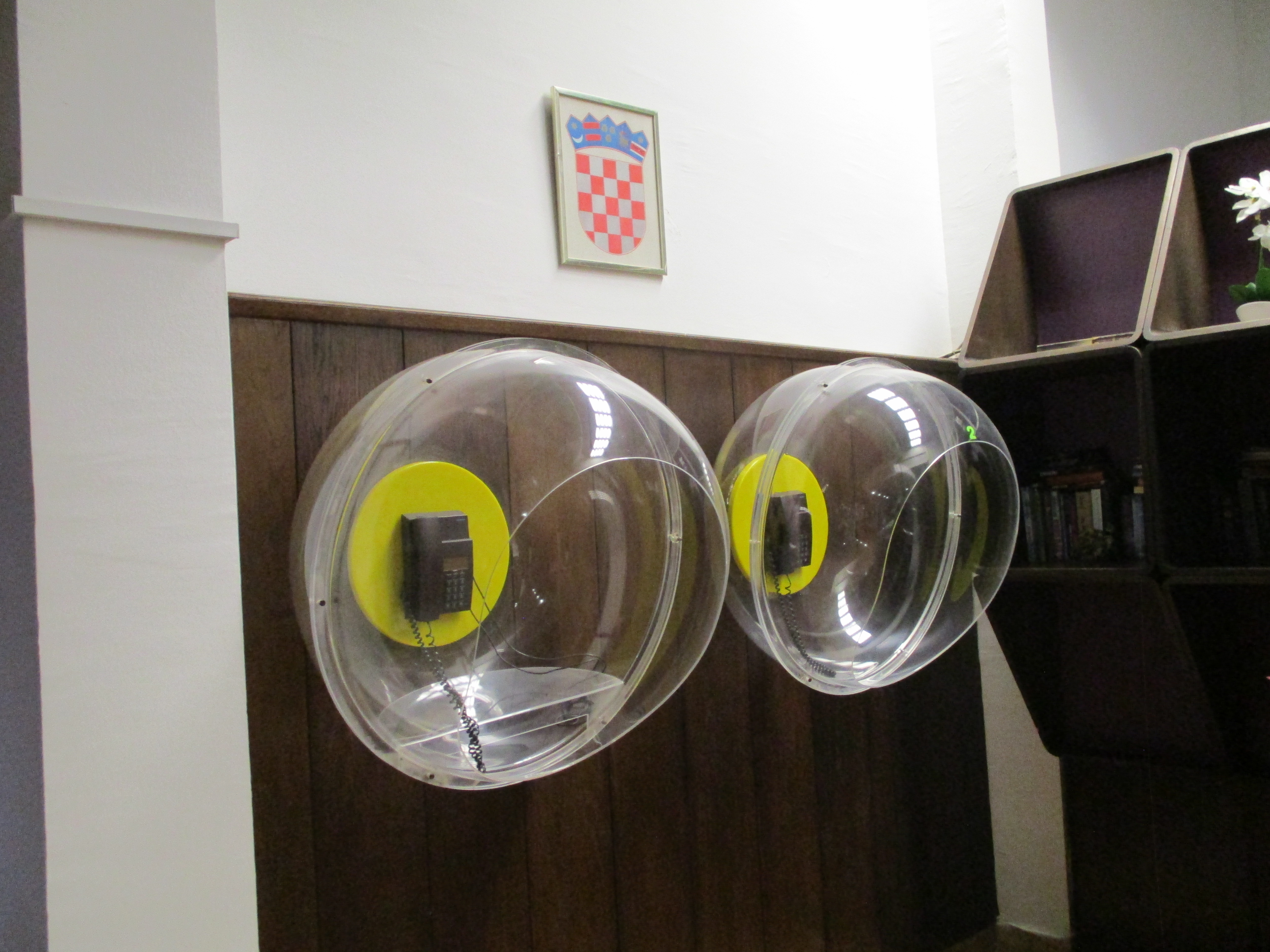 Below are some photos of the Hotel Biševo in Komiža, one of the two hotels built during the Socialist era of the mid-twentieth century. The hotel is nestled into the mountain at the end of Ribarska Ulica. While the rooms are very basic, the ones facing the sea have stunning views. And it is fascinating to take a walk around inside, even if you are not staying there. It’s like stepping into a Socialist-era time capsule as minimal updates have occurred over the years. Clockwise, from left: 1) the multi-level Hotel Biševo as seen from Komiža’s harbor. 2) Common area boasting 1960s décor, unchanged since the hotel was built. 3) Retro phone booths in the hotel lobby.