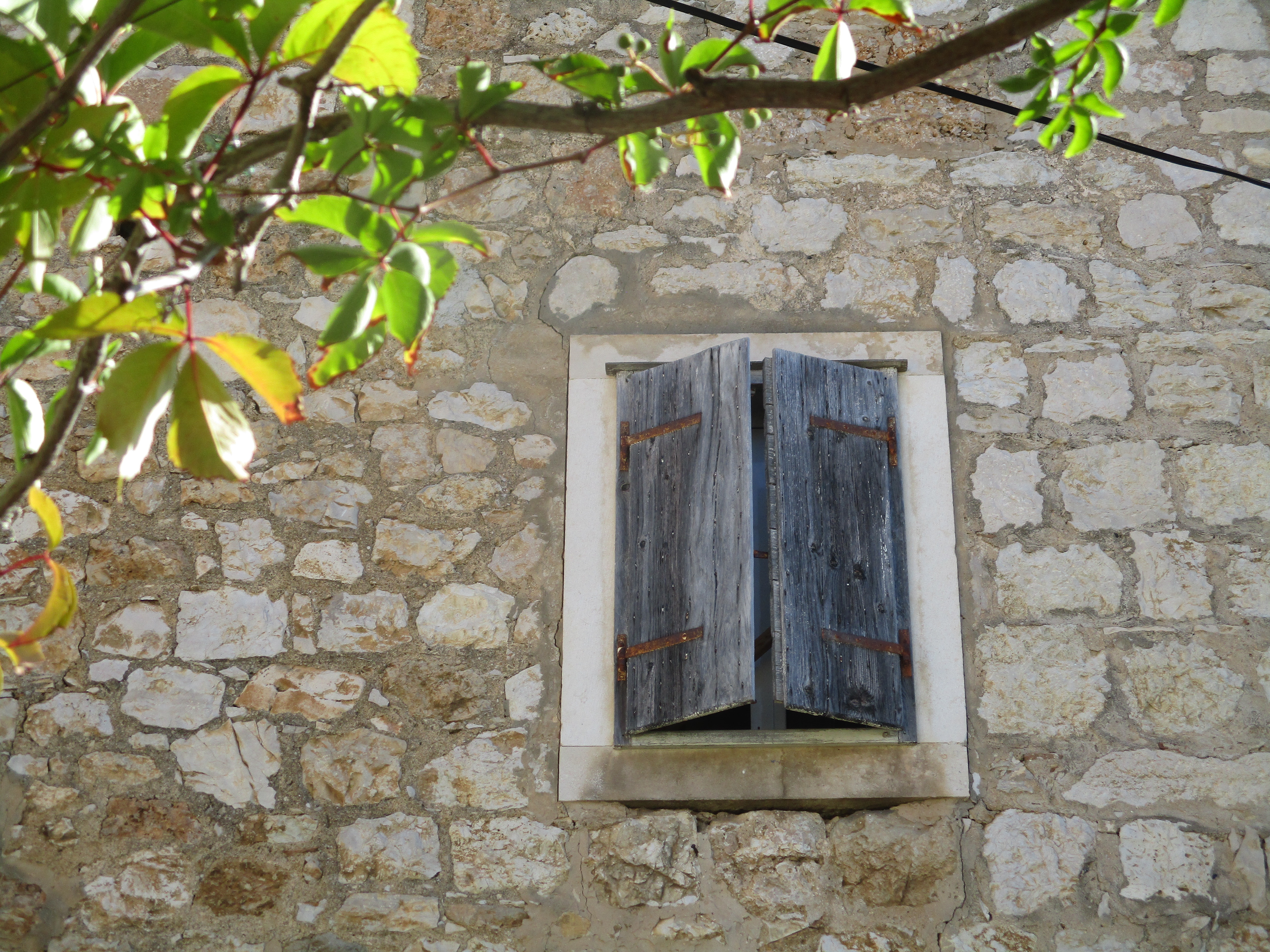 Below are some photos of the house and its grounds. Top row, from left: 1) Ribarska Ulica, or “Fisherman’s Street” in Croatian, one of the quaint alleyways Komiža is known for and where the house we rented was located. 2) Entrance to the grounds from Ribarska Ulica. Two houses were accessed by this gate. Our neighbors were a long-time Komiža family who live there year round. In the middle of the photo you can see the vines covering the dining table. And bottom row, clockwise from left: 1) Our niece and nephew riding around on their cute animal suitcases with wheels, and Jaroslav; our nephew can be seen greeting the neighbors who had their door open. 2)The kitchen of the house. Note the exterior stone wall made of the karst limestone typical of Dalmatia. 3) Rustic window with shutters overlooking the terrace.