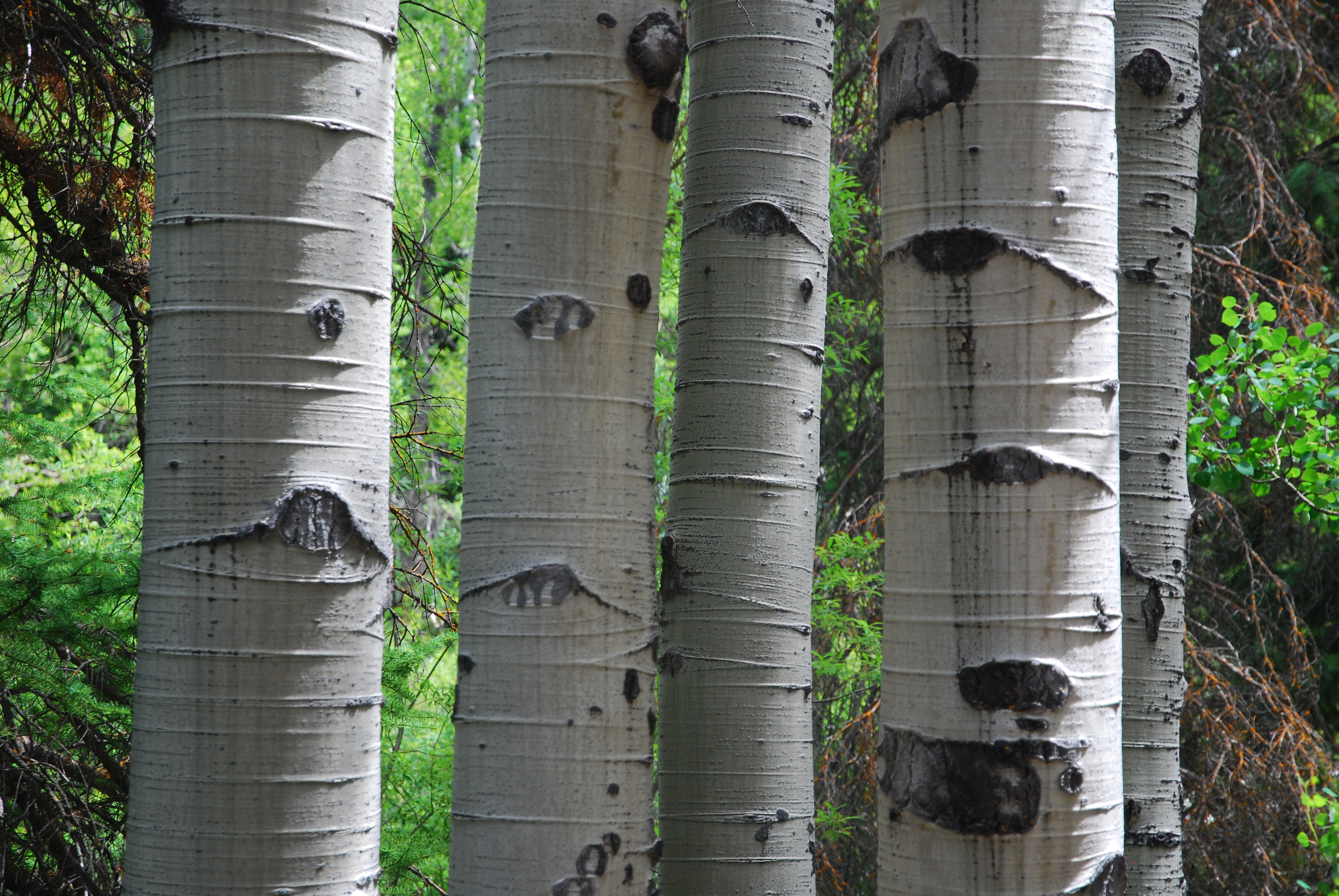 The above three photos were taken during a hike along the Hunter Creek Trail, one of my favorite places to hike in the Aspen area. Clockwise, from left to right: 1) Close-up of aspen leaves, with their unique, distinctive and immediately recognizable shape. The delicate leaves emit a satisfying sound as they quiver and shake when a breeze passes through, making an aspen grove one of the most calming and relaxing places to experience. 2) Aspen tree trunks. The eye-like markings are formed when the tree sheds its branches. 3) Hunter Creek. The water tumbles over the rocks and boulders as if falling down a staircase.