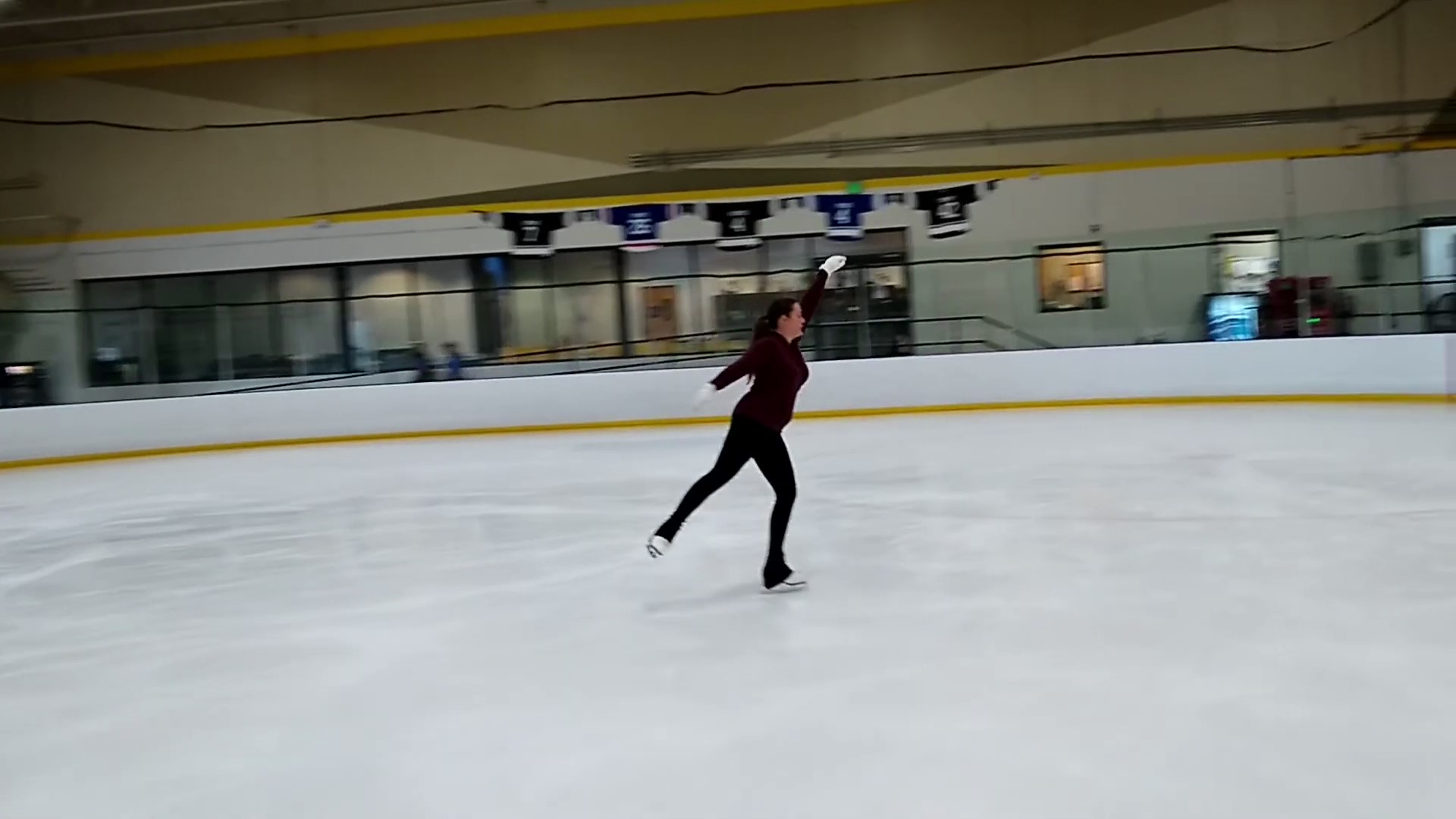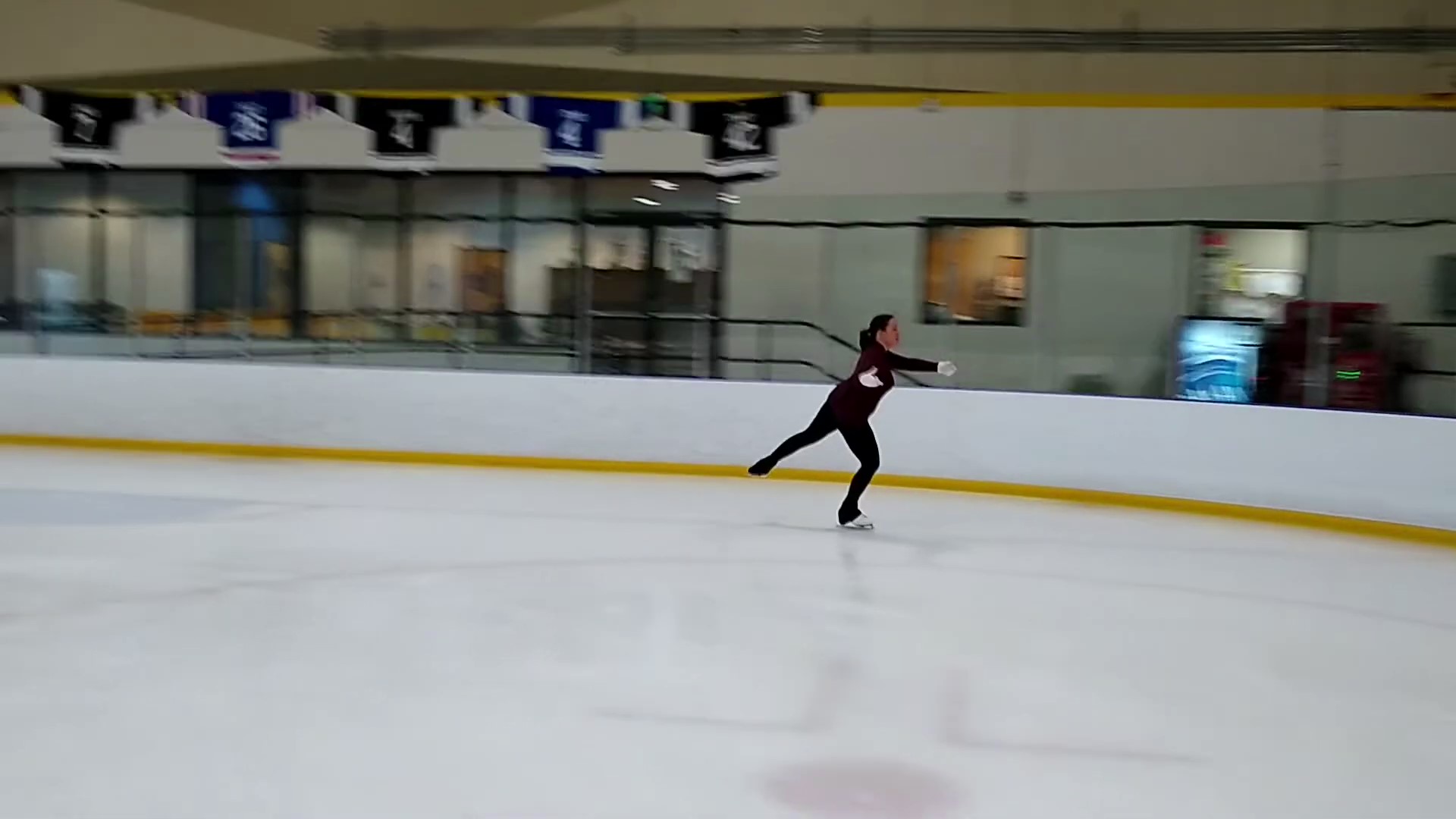 The above photo captures the side step wide onto the right backward inside edge. The weight shift to the right side of the body is evident, as is the correct edge. This photo was taken shortly after I learned the Champion’s Lap so I was still in the process of discovering how to add finishing touches.