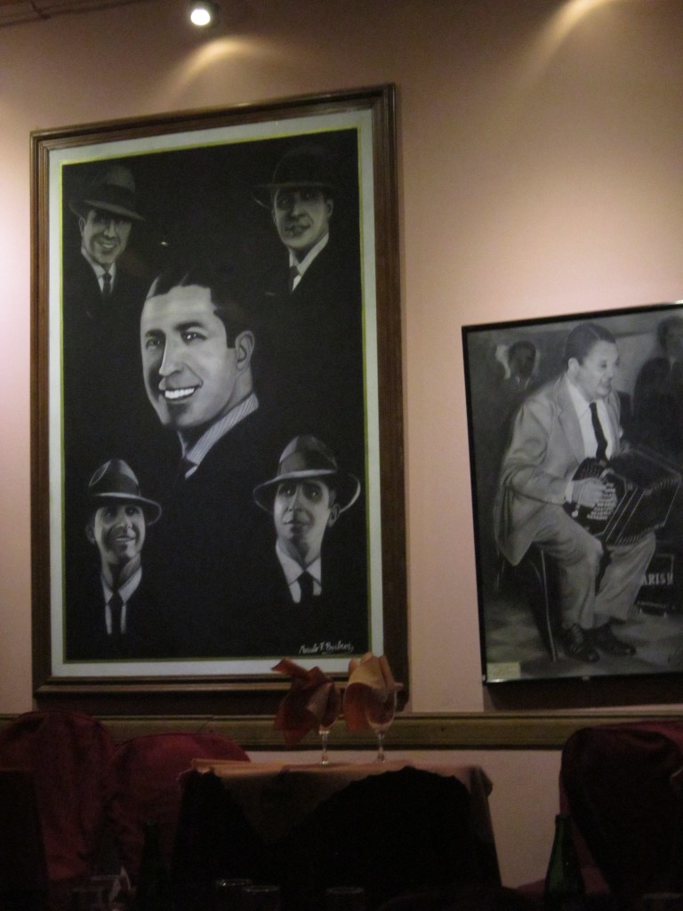 View of the theatre before the show commenced. The theatre’s walls are adorned with photos of tango stars. My husband can be seen in the foreground from behind in the blue shirt at our four-top table next to the stage.