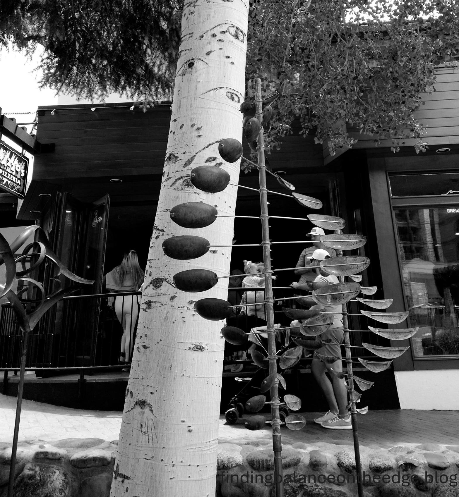 In this photo I took in Vail, Colorado, USA in July 2024, an aspen tree and Whitaker Wind Sculpture meld together in a seamless and organic way. I like how the bean-like features of the copper “Double Helix Horizontal” wind sculpture do double-duty as the “eyes” of the aspen tree’s chalky white trunk. The darkContinue reading “Monochrome Monday Nature-Art Meld”
